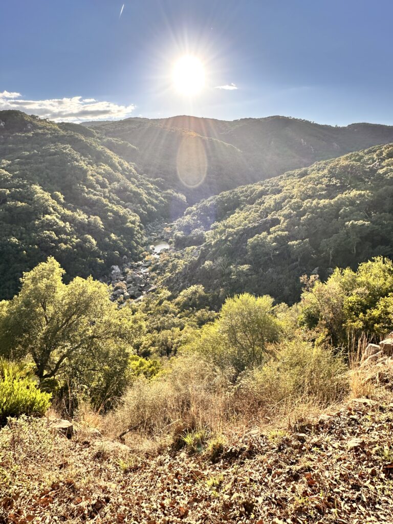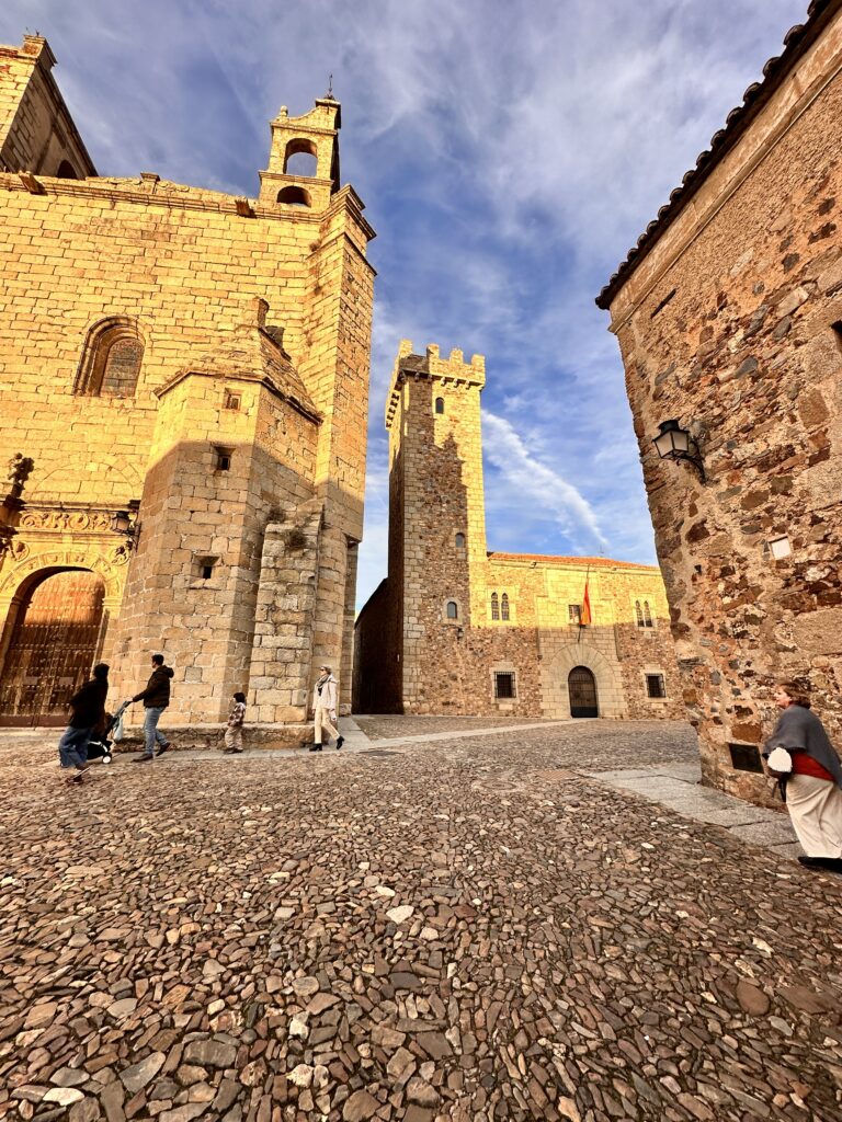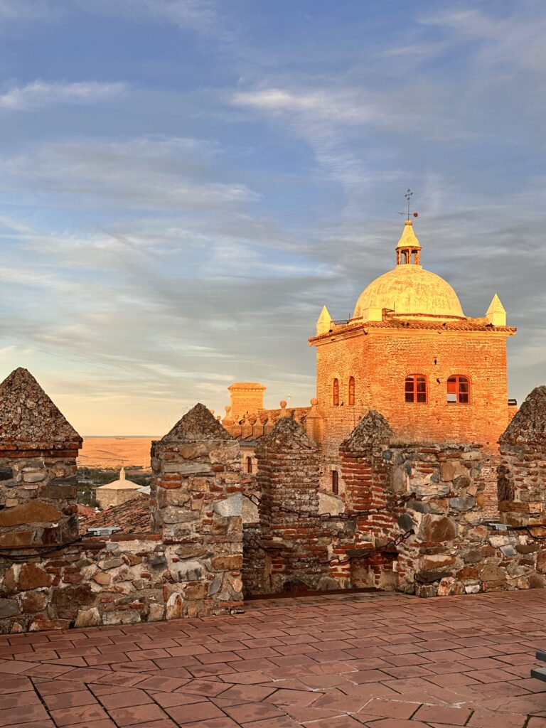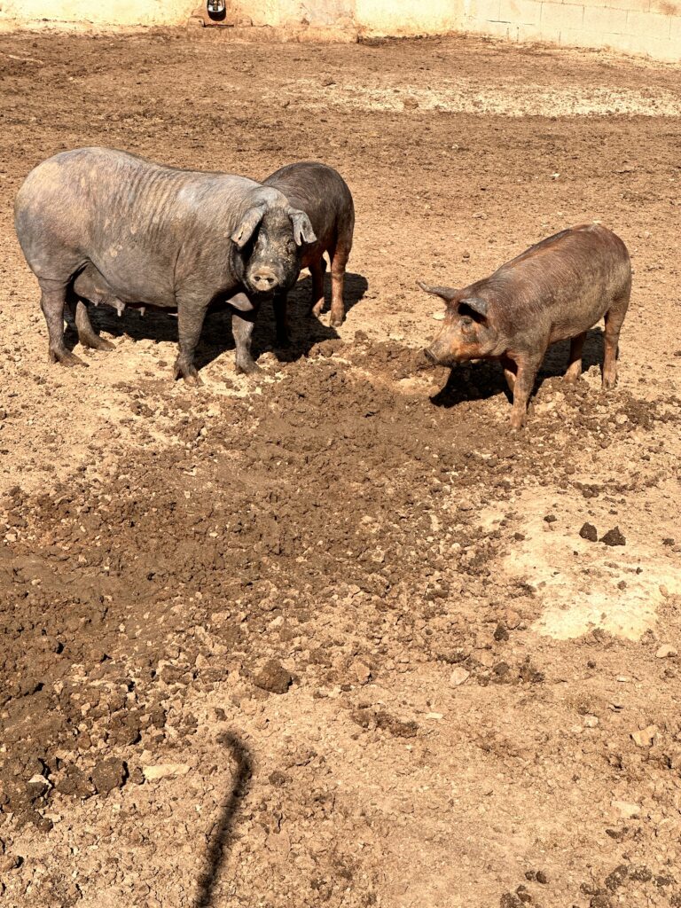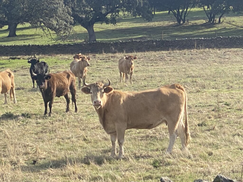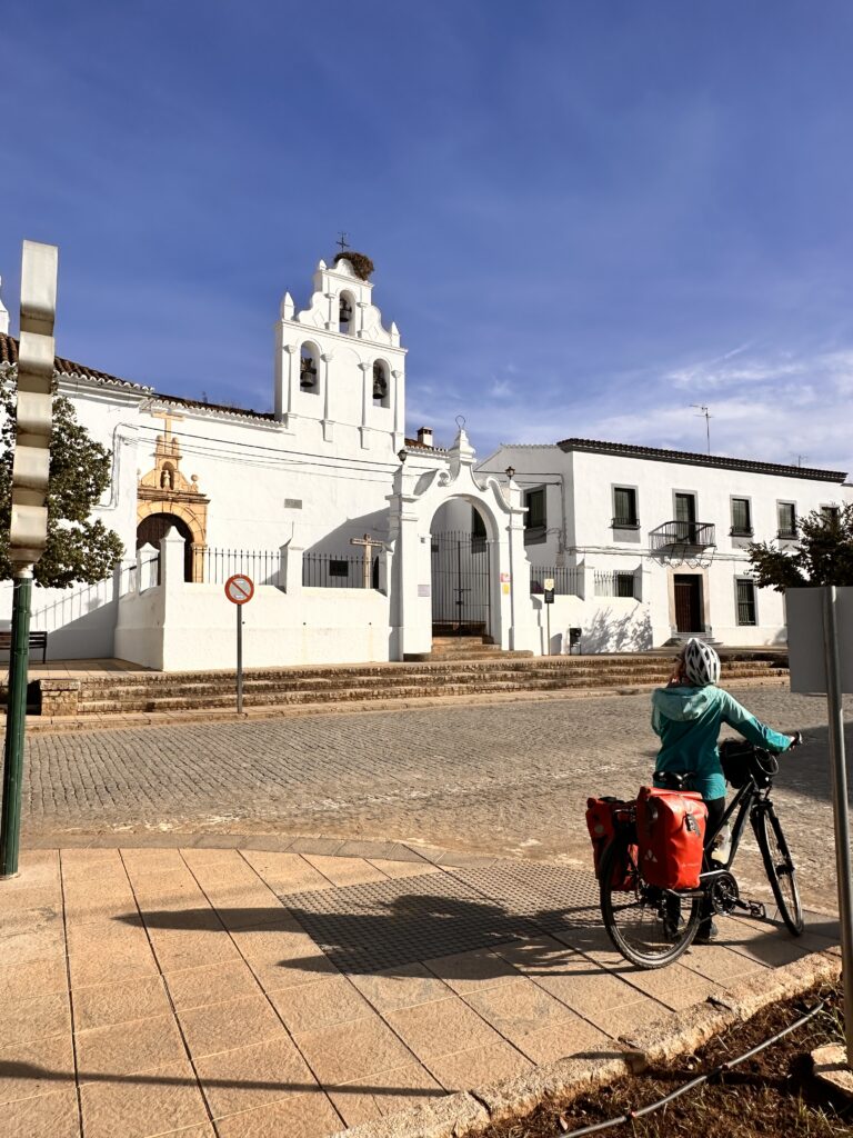 Ich sage mir dann aber immer, dass es sicher bald besser wird und so ist es dann (zumeist) auch. Man kommt durch traumhaft schöne Orte, von denen ich bis jetzt noch nichts gehört habe, die einem viele Wow-Momente bescheren und staunen lassen. Und mit etwas Glück ergattern wir ein leistbares Zimmer in einem toll hergerichteten historischen Gebäude mit netten Gastgebern. Und so sind wir auch zufällig in Llerena bei Lola und Julio in ihrem schönen Casa Rural „Cieza de Leon“ gelandet. Llerena lag eigentlich gar nicht auf unserer geplanten Route, die Wettervorhersage zuerst 1 Tag starker Wind und dann 4 Tage Starkregen ließen uns umplanen. Wir wollten den windigen (aber sonnigen) Tag noch nützen und eine kürzere Tour planen, die dann aber in einem Ort mit Bahnhof endet, damit wir bei Regen mit dem Zug die Strecke nach Sevilla zurücklegen können. Radeln bei Gegenwind ist nicht lustig, aber 45km sollten zu schaffen sein. Wir kommen an vielen landwirtschaftlichen Anwesen vorbei, können einen Blick auf die vielen Kühe und Stiere (viele sind für die Kämpfe in den überall sichtbaren Arenen bestimmt) werfen oder uns auch über die sehr witzigen iberischen Schweine (die zu schmackhaftem „Pata Negra“, einem Rohschinken verarbeitet werden) amüsieren. Die schwarzen Tiere sind einerseits sehr schreckhaft – sobald wir mit den Fahrrädern bei ihrem Gehege vorbeifahren, stoben sie laut grunzend auseinander – um gleich im nächsten Moment wieder ganz neugierig ums Eck zu lugen.