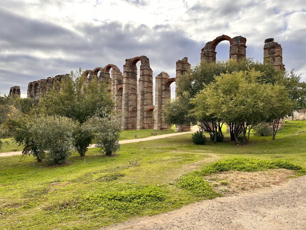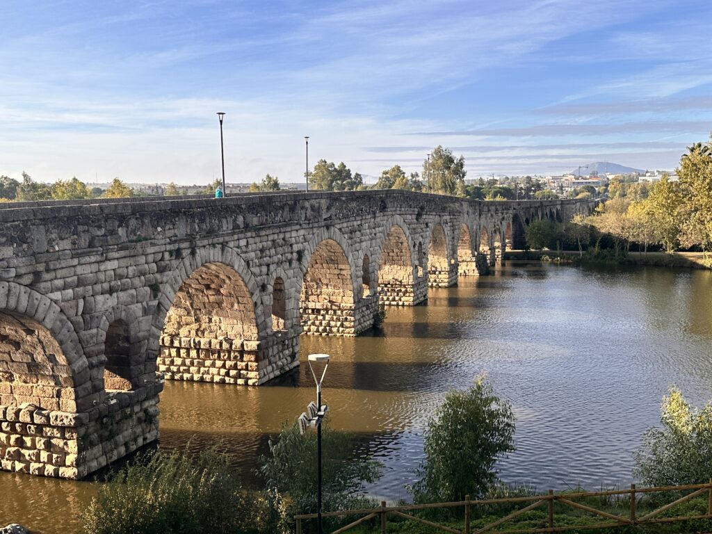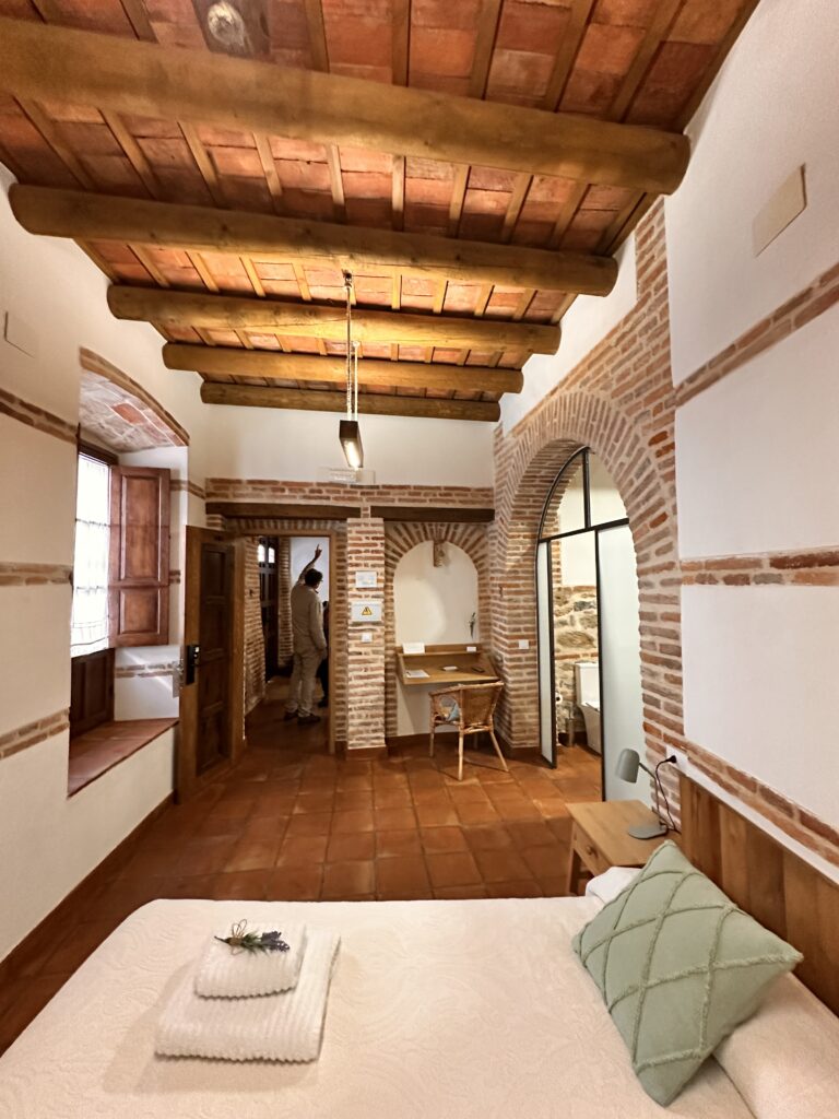 Aber nun zurück zu Llerena und unsere tolle Unterkunft. Das „Cieza de Leon“, eine Töpferei mit Herrenhaus aus dem 14. Jahrhundert, errichtet im „Mudejar“-Stil (eine sehr sehenswerte Kombination aus maurischer und iberischer Kunst) wurde 2020 von Lola und Julio in ziemlich heruntergekommenem Zustand gekauft und anschliessend sehr geschmack- und liebevoll restauriert. Das Resultat: 7 individuell gestaltete Gästezimmer und großzügige Allgemeinflächen. Und das ganze zum wohlfeilen Preis von 90,0o € inklusive Frühstück – leider können wir nur 2 Nächte bleiben, da die Unterkunft über das Wochenende ausgebucht ist. Da der vorhergesagte Regen auch tatsächlich kommt, beschließen wir die 130km nach Sevilla mit der Bahn zurückzulegen. Die Tickets sind online einfach zu buchen – die Mitnahme der Räder im „Media Distancia“ Zug der spanischen Staatsbahnen RENFE ist kostenlos. Außer uns hat an diesem verregneten Tag ohnehin niemand ein Fahrrad dabei.