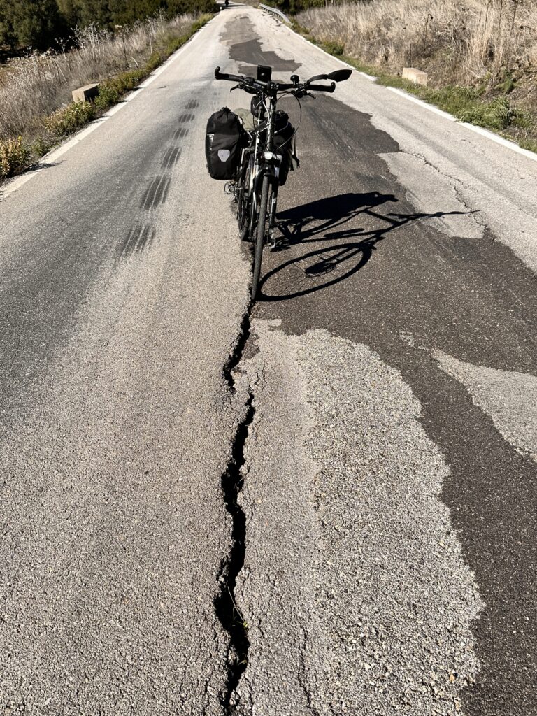 Will man die spanische Etappe in einem Satz zusammenzufassen, dürfen die Worte „anstrengend“, „wunderschön“ und „sehenswert“ nicht fehlen. Ausnahmslos jeder Radlertag in Spanien war anstrengend, wobei nicht nur die zu bewältigenden Höhenmeter eine Rolle spielen, sondern sehr oft der lose Untergrund, auf dem man einsinkt und der einem das Gefühl gibt, dass man mit dem höchsten Gang unterwegs ist, obwohl ein mittlerer Gang drinnen ist. Oder starker Gegenwind gegen den man ankämpfen muss bzw. starker Seitenwind, der einen in die stark befahrene Fahrbahn drückt, sodass das ganze auch noch gefährlich wird. Oder auch, wenn man einmal 10km auf einer stark befahrenen Bundesstraße fährt (was sich manchmal ergibt) – der Lärm und die Geschwindigkeit der vorbeirasenden Fahrzeuge ist extrem belastend und teilweise beängstigend, sodass erleichtertes Aufatmen angesagt ist, wenn man auf eine wenig befahrene Strasse kommt.