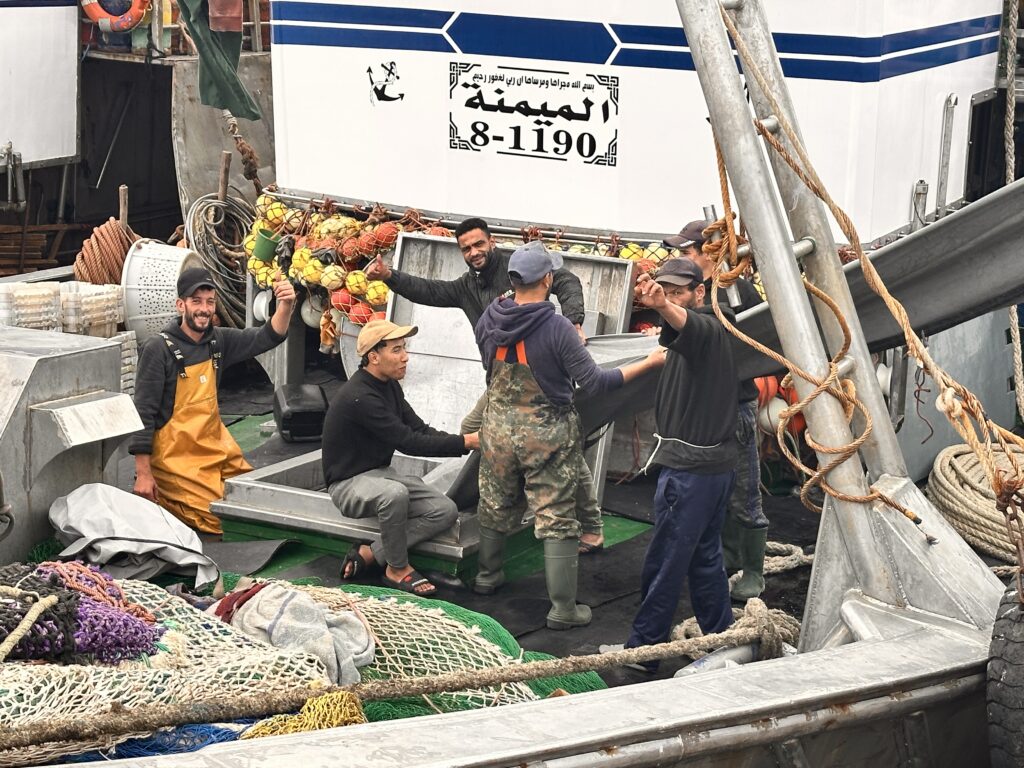 Um die Wartezeit zu verkürzen, helfe ich mit, ein schweres Schleppnetz, das am Kai liegt, wieder an Bord eines Bootes zu ziehen. Auf Kommando (Ho Ruck!) und unter Mithilfe vieler Hände wird gezerrt und gezogen – schließlich liegt es wieder einsatzbereit an Deck des Fischkutters. Die Fischer – lauter raue Burschen – sind immer ca. 1 Woche auf hoher See unterwegs, bevor sie voll beladen mit Meerestieren, die unter Deck gleich mit Eis gekühlt werden, wieder in den Hafen kommen.