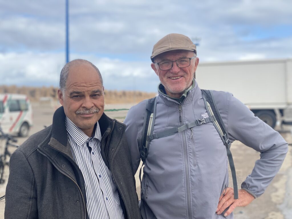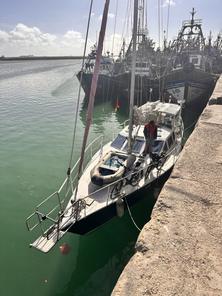 Nach Rupi‘s Ankunft im Hafen von Tarfaya heisst‘s einmal warten. Dieter und ich dürfen zwar das bis dahin für uns versperrte Hafengelände betreten und nach Kontrolle unserer Pässe durch die Hafenpolizei weiterradeln zum Kai, wo Rupi mit seinem Boot liegen soll. Dort angekommen, sehen wir nur eine Menge Fischkutter – aber kein Segelboot. Ein sehr freundlicher Mann in Zivil steigt aus einem Polizeifahrzeug – er stellt sich als Polizeichef von Tarfaya vor – und deutet auf eine Stelle zwischen den Kuttern. Wir können noch immer kein Segelboot sehen, nur der obere Teil eines eines Mastes ragt über die Kante des Kais. Wir gehen an den Rand des Kais: ca. 5 m unter uns (es ist grad Ebbe) liegt das Segelboot – Rupi steht an Deck.