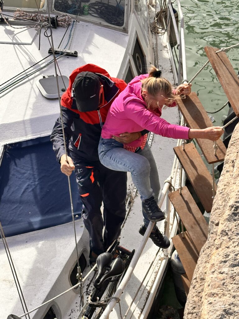 Beim Anblick der wackeligen Strickleiter verlässt mich der Mut. „Ich steig da nicht runter – ich geh in ein Hotel und suche mir morgen einen Fischer, der mich mit seinem Boot zu Rupis Boot bringt.“ Erst nach langem Zureden und Sicherung mit einem Gurt, wage ich den Abstieg (Dieter steht am Kai und sichert mich, während Rupi das Boot ganz nah zur Kaimauer zieht, sodass ich keinen zu großen Schritt von der Leiter zum Boot machen muss). Das ganze findet statt unter den neugierigen Blicken der Fischer – ich glaube, die haben schon Wetten abgeschlossen, dass ich mich nicht hinunter traue – und zum Schluss gibts Applaus, weil ich gut an Deck ankomme. Bei der nächsten Flut – es sind jetzt nur noch 3 Höhenmeter zu überwinden – werden dann auch unsere Fahrräder an Bord gehievt und an der Reling festgebunden.