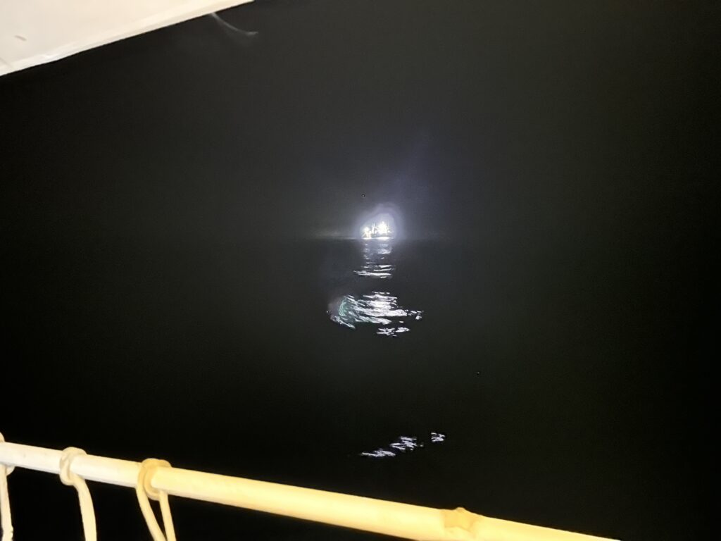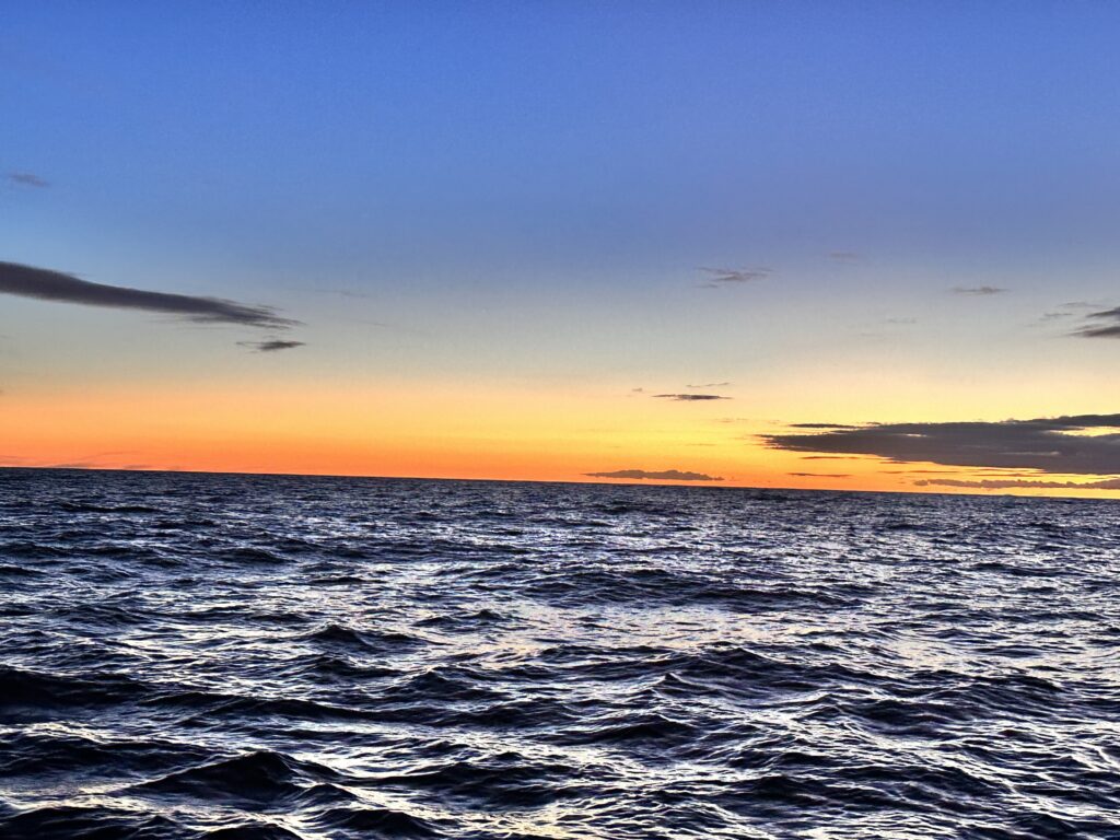 Bis dahin dauert es aber noch. Der Wind wird immer schwächer, sodass wir nur noch mit 2 Knoten (weniger als 4km/h) gemütlich Richtung Westen segeln. Es ist nicht viel zu tun – der Autopilot hat übernommen. Mittlerweile sehen wir kein Land mehr – nur noch Meer und Himmel. Kurz vor Sonnenuntergang taucht neben dem Boot ein Schwarm Delphine auf. Vergnügt und „leichtfüßig“ springen sie aus dem Wasser, tauchen kurz unter, um gleich zum nächsten Sprung anzusetzen. Die Säuger begleiten uns ca. 5 Minuten, bevor sie abdrehen und in der Weite des Meeres verschwinden. Eine schöne Begegnung, die fröhlich stimmt.
