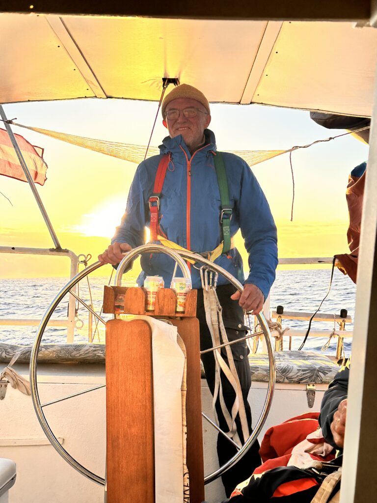 Der Wind lässt etwas nach und auch die Wellen sind nicht mehr so hoch. Ich döse vor mich hin und werfe ab und zu einen Blick aufs Wasser. Die starke Übelkeit ist vorbei, ein flaues Gefühl im Magen bleibt. Auch Dieter wirkt wieder etwas lebendiger. Vielleicht doch ein kleines Frühstück? Dieter geht in die Kombüse und macht ein paar Käsebrote. Okay, ein Bissen. Dann noch einer. Ganz langsam kauen. Dazu ein Schluck Wasser. Kurz darauf kommt alles wieder hoch. Ich beschließe, erst wieder zu essen, nachdem wir im Zielhafen angelegt haben.