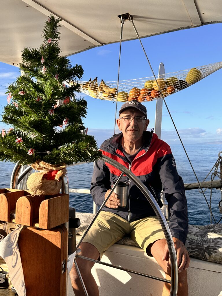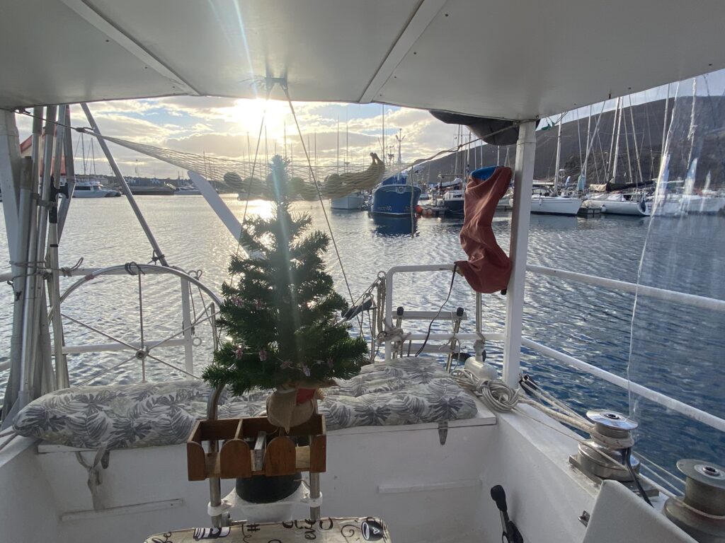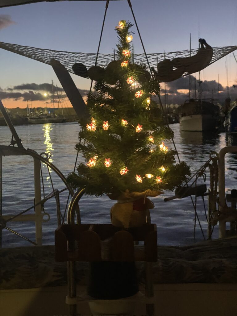 Dann heissts einkaufen gehen, Wäsche waschen (Rupi hat eine Waschmaschine an Bord), Boot putzen – innen und hauptsächlich außen- der Saharasand hat sich überall festgesetzt. Und – Weihnachten steht vor der Tür! Rupi hat einen Plastikweihnachtsbaum, der von Dieter zurechtgezupft und mit Lichterkette dekoriert wird, bevor er am Steuerstand festgemacht wird. So manches Nachbarboot ist ebenfalls weihnachtlich illuminiert, sodass auch fern der Heimat so etwas wie Weihnachtsstimmung aufkommt. Unsere Nachbarn am Steg, eine dänische Familie mit 3 Kindern (2 Buben mit 14 und 8, 1 Mädchen mit 11 – sie werden von der Mutter bzw. online unterrichtet), die sich auf einer 2-jährigen Segeltour befindet, bringen uns einen Teller selbstgemachte Weihnachtskekse vorbei. Wir revanchieren uns mit einem Apfel-Nussstrudel, frisch aus dem Backrohr.