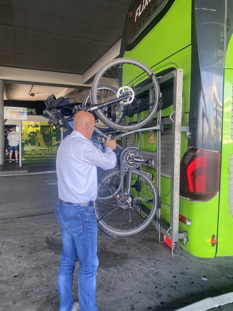 Während man bei den Railjets der ÖBB das Rad erst mal mühsam die Stufen hochheben muss (die Taschen muss man dazu abnehmen und dann extra raufschleppen) und dann auf engem Raum um eine 90 Grad Kurve manövrieren und anschliessend das Vorderrad an einem Haken an der Decke einhängen muss, schiebt man das Rad ganz easy (ohne Niveauunterschied) in die Westbahn, wo es bei jedem Einstieg 2 Fahrradplätze gibt, nimmt die Taschen runter, befestigt es an der vorgesehenen Vorrichtung und nimmt entspannt Platz am reservierten Sitz in der Nähe des Fahrrades. Dann noch ein schneller Self-Check-In (ist in der Westbahn-APP mit 2 Klicks erledigt) und schon kann die Fahrt losgehen, ohne dass man beim Schaffner eine Fahrkarte vorweisen muss – der Zugbegleiter sieht auf seinem Tablet, wer bereits eingecheckt hat.
