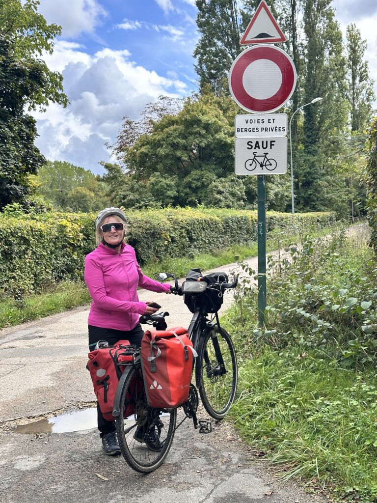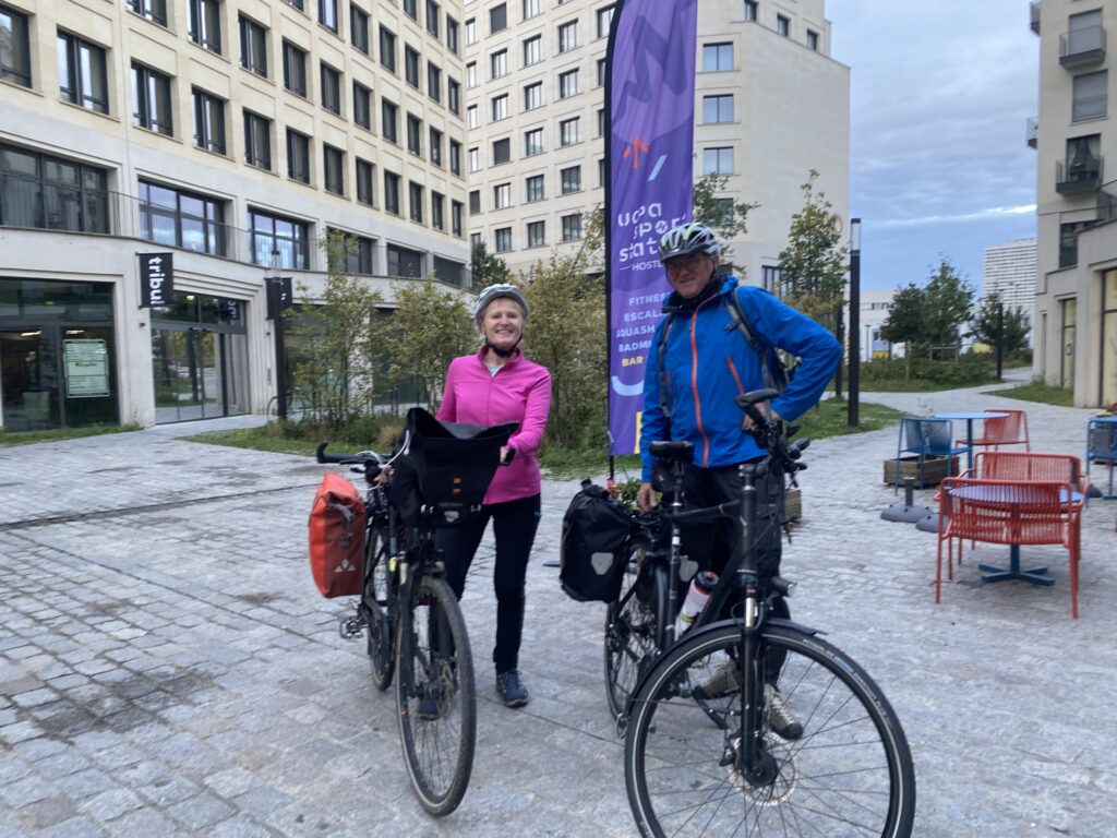 Nach der Ankunft in Stuttgart radle ich gemütlich in das ca. 14km entfernte Filderstadt (in der Nähe des Stuttgarter Flughafens), wo ich in einem Hotel einchecke. Am nächsten Morgen noch schnell die paar Kilometer zum Flughafen geradelt – von dort geht es dann weiter mit dem Flixbus nach Paris. Auf der Rückseite des Busses gibt es eine Vorrichtung zum Aufhängen der Räder – der Flixbusmitarbeiter erledigt das für mich und befestigt mein Rad. Nach einer ziemlich langen Busfahrt (es gab immer wieder Stau auf den Autobahnen) am Samstag um 20:00 endlich Ankunft am Busbahnhof an der Seine. Dort wurlt es – ich habe das Gefühl, halb Paris ist hier. Dieter, der schon vor einigen Stunden ebenfalls mit dem Flixbus aus Bielefeld angekommen ist und bereits im Hotel eingecheckt hat, holt mich ab und wir radeln gemeinsam in das 10 km entfernte Hotel im Norden der Stadt im 19. Arrondissement. Es ist ein warmer Samstagabend und Unmengen von Menschen auf den Straßen – die Gastgärten der Lokale sind alle gesteckt voll. Auf den Radwegen spielt es sich ebenfalls ab – das Positive ist, dass die Wege immer baulich getrennt vom Auto- und Fussgängerverkehr sind, sodass sich alle Verkehrsteilnehmer sicher fühlen. „Uj, hier brunzelt es aber“, sage ich zu Dieter und rümpfe die Nase. Wir passieren gerade eine eher dunkle Ecke der Stadt. „Was brutzelt hier?“ fragt er zurück. „Nicht brutzeln, sondern brunzeln (Dieter muss ab sofort österreichisch lernen!!) – riechst du das nicht?“ „Es riecht nach Pisse – schau mal, wieviele Zelte da unter der Bahnunterführung stehen.“ Und dann sehe ich es auch – Unmengen an Zelten und Verschlägen. Lauter Obdachlose, die da hausen ohne sanitäre Einrichtungen – noch lange habe ich den scharfen Gestank in der Nase. Nach der Ankunft im Hotel noch ein Drink und Planung für den nächsten Tag – unser erster gemeinsamer Radlertag.